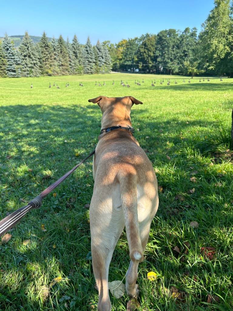 The geese have taken up residence by the house. They love to sit under the apple trees. Our dog is intent on chasing them so we keep him on a lead to give them space.