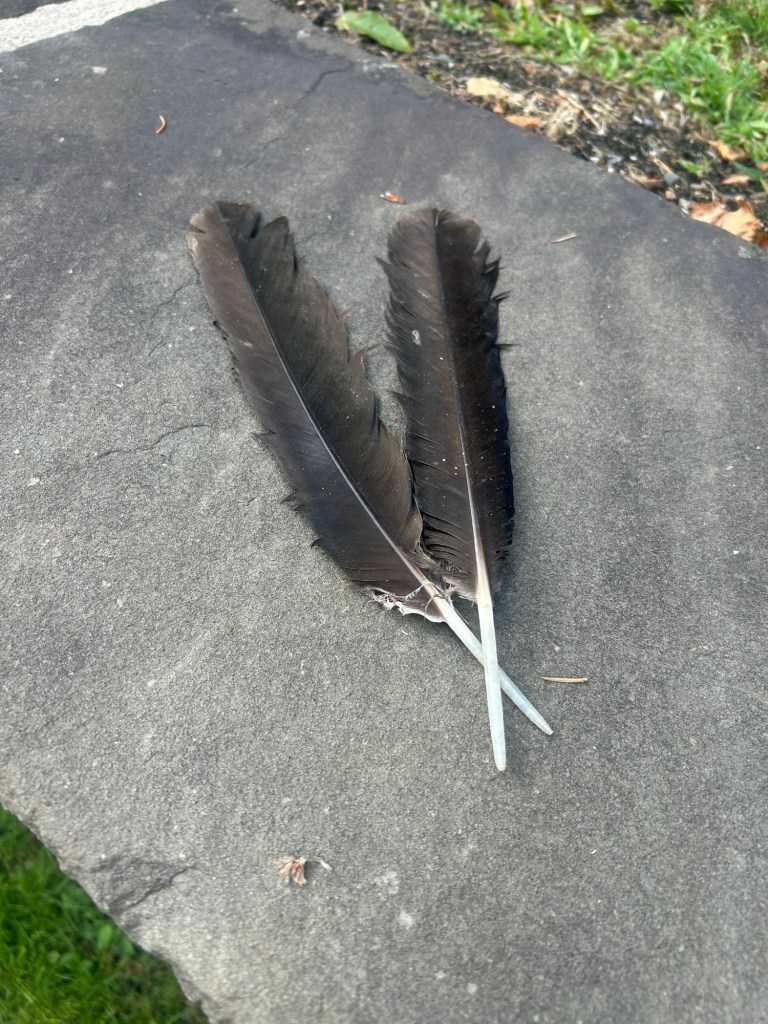 This morning I headed to the lake with dog. The wind invigorating and energizing our steps. As I walked along a path, two feathers greeted me. They were squarely in my path.